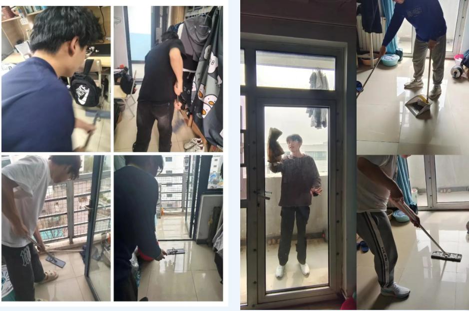 在宿舍大扫除活动中,学生们对寝室进行了全面的清洁打扫,尤其是针对室内地面、窗户等卫生死角区域和各类物品的摆放整理。各专业辅导员对学生是否违规使用大功率电器的情况、杂物堆放情况、垃圾下楼情况进行详细的检查、记录和监督整改,督促同学们养成良好的卫生习惯。