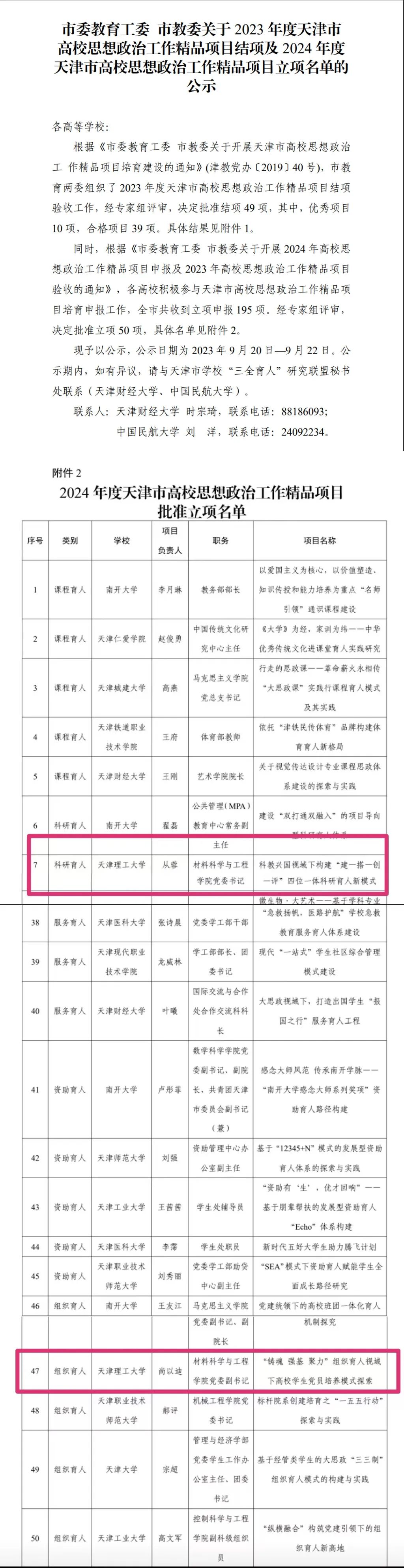 近日,市委教育工委市教委公布了2024年高校思想政治工作精品项目获批立项名单,学院《科教兴国视域下构建“建-搭-创-评”四位一体科研育人新模式》和《“铸魂 强基 聚力”组织育人视域下高校学生党员培养模式探索》两个项目分别在科研育人和组织育人类别中脱颖而出、获批立项。