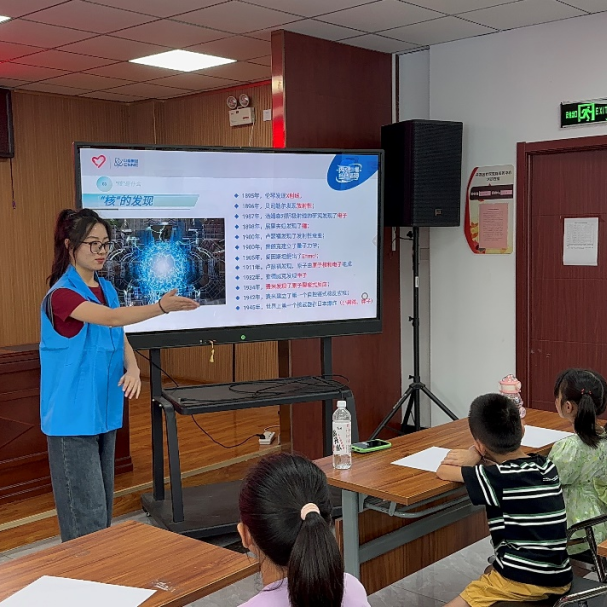 这次活动主题是“铀”的三生三世。志愿者首先向小朋友讲解了铀在自然界中的分布矿藏和开采提取过程,然后进一步介绍了我们如何通过将铀转化为可用的核燃料,让铀在裂变过程释放出巨大能量,最后,志愿者讲解了我们是如何控制裂变过程,以产生可持续的能源。这些知识让同学们更加深入地认识到铀在核能源中的关键作用。宣讲最后,小朋友们通过观看“铀”的相关视频,加深了本次宣讲的印象,强化了认识,在寓教于乐的同时也大大提高了对科学的求知欲。