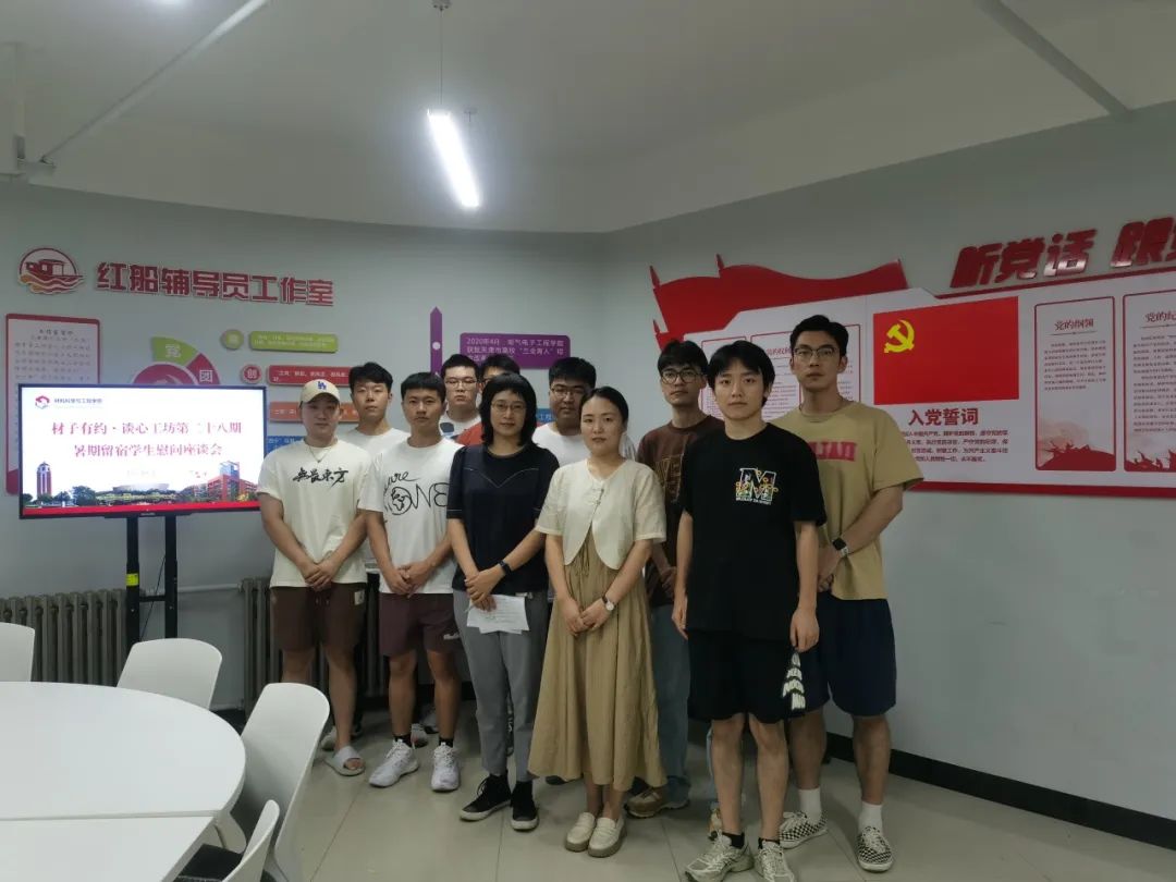 为确保学生暑期留宿安全,提高学生留宿学习效率,材料学院于8月1日在“红船”辅导员工作室开展暑期留宿学生慰问座谈会,学院党政领导、辅导员代表参会,本硕博留宿学生代表参与座谈。