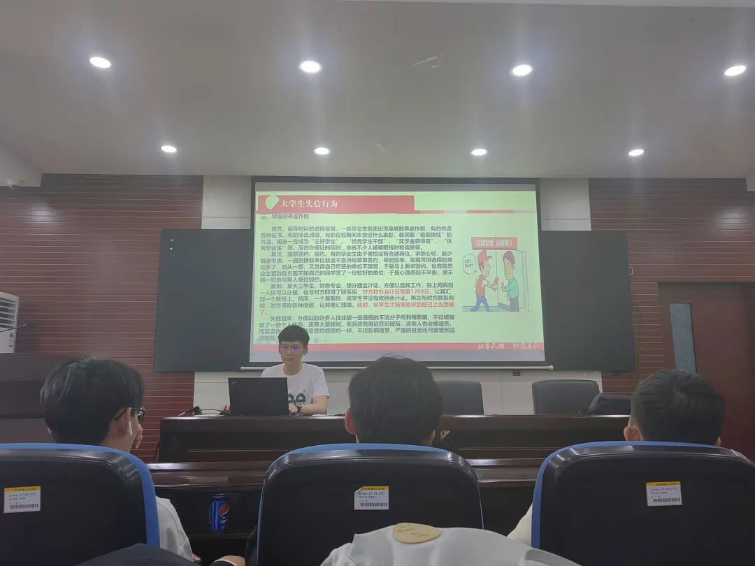 会上,学院辅导员向毕业生讲解了助学贷款的还款方式和需要注意的相关事项,对学生提出的相关问题进行解答。随后,学院辅导员向与会同学普及助学贷款违约的相关后果,强调了个人征信的重要性。最后,学院辅导员为学生讲解了学习诚信、交往诚信、就业诚信和资助诚信的好处,引导同学们在今后的学习和工作岗位上保持踏实工作、诚信处事的作风。