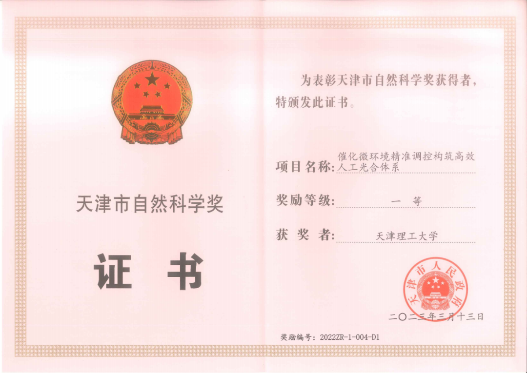近日,天津市委召开天津市科学技术奖励大会暨实施科教兴市人才强市行动部署会,由伟德国际1946源于英国鲁统部教授担任第一完成人的“催化微环境精准调控构筑高效人工光合体系”项目获得2022年度天津市自然科学奖一等奖。