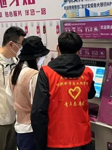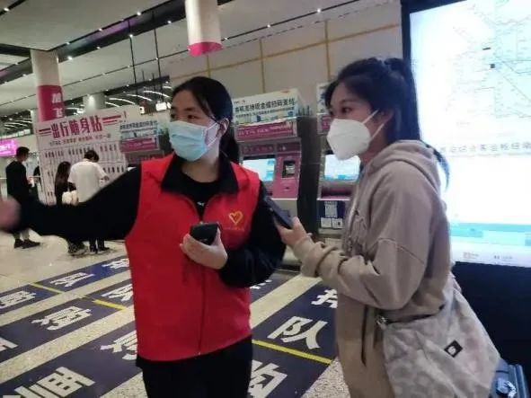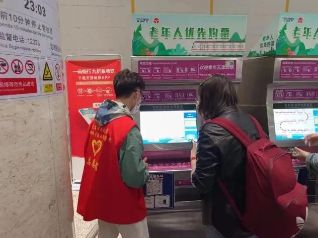在天津西站,志愿者们身着红色马甲,按照工作人员的安排值守在指定岗位,在地铁口帮助外地乘客解答乘车问题、指引路线;在闸机口指引乘客投票、刷卡乘车,帮助携带大件行李或婴儿车的乘客顺利通行;在自动购票机处协助乘客有序排队购票、换乘。每一次的友好交流都是爱心最美好的印记。