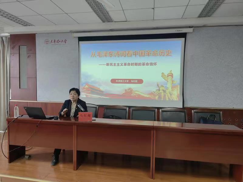 此外,学院邀请“全国教育系统先进工作者”、天津市三八红旗手、天津市优秀党务工作者、优秀思想政治工作者、我校组织员马红建老师以毛泽东诗词为切入点,开展了《从毛泽东诗词看中国历史——新民主主义革命时期的革命情怀》的专题党课。在课中,马红建老师首先介绍了毛泽东与毛泽东诗词,再带领同学们饱含激情的朗诵了《西江月·井冈山》《七律·长征》《沁园春·雪》《七律·人民解放军占领南京》四首毛泽东诗词,用通俗易懂的话语赏析着每一首诗,解析了新民主主义革命这段光辉历史,带领同学们深切体会毛泽东独特的人格魅力与中国共产党不怕艰险、迎难而上的革命精神。