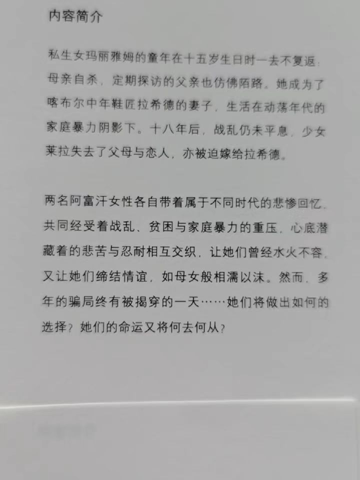 我曾三读这本书,遍遍拜读更有体会。"人们数不清她的屋顶上有多少轮皎洁的月亮,也数不清她的墙壁之后那一千个灿烂的太阳"这是诗人赛依伯的诗作《喀布尔》里的话,胡赛尼将阿富汗这个动荡不安的国家,最黑暗血腥的几十年,毫无保留地抖露出来,暴露在阳光下。通过对两个女性生活来映射出这个积贫孱弱的民族数十年的纷繁动乱与内忧外患,令人震撼其中。