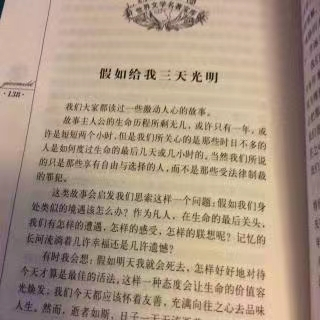 一寸光阴一寸金,寸金难买寸光阴。海伦希望拥有三天的光明去看尽世界的一切景观,三天光明对于常人来说只是人生中的短暂的一刻,可对于双目失明的海伦来说,却只是可想而不可及的。在书中她设想了自己三天的光明生活:看一眼身边最亲近的人,将他们永存内心;在电影院中感受视觉的快乐;感受城市中人们忙碌的生活。