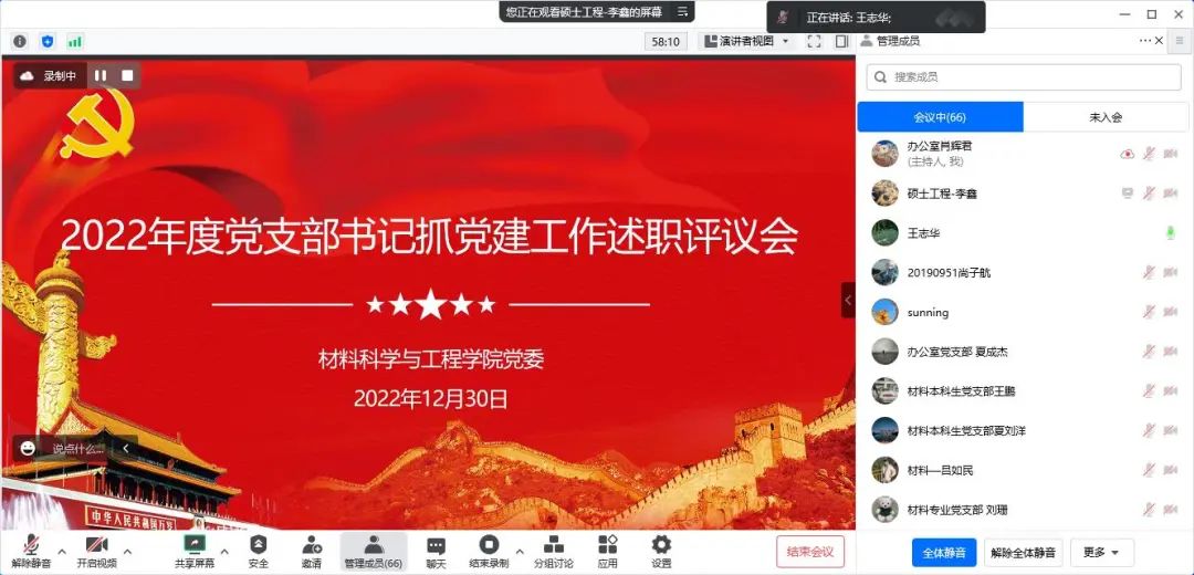 会议开始,党委书记从蓉通报党建调研情况,重点反映调研中发现的问题。随后,材型专业党支部书记王志华、办公室党支部书记肖辉君、晶体研究院党支部书记胡章贵、材料本科生党支部书记尚帅、功材本科生党支部书记李晓亭、专硕第一党支部书记何朝成、硕士新材料党支部书记刘喜正等7人依次现场述职,重点就党支部工作中存在的问题原因及下一步改进措施进行发言。学院党委委员逐一点评,党支部书记们纷纷表示虚心接受、认真整改。与会人员对全部参加述职的党支部书记抓党建工作履职尽责情况进行线上评议。