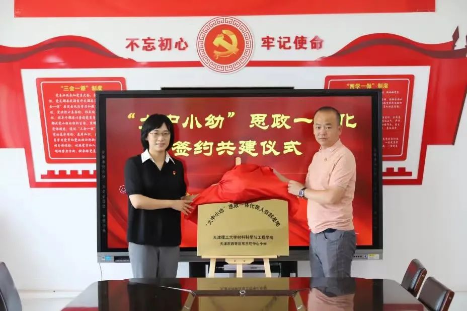 活动开始,东兰坨中心小学校长宋春军和材料学院党委副书记尚以迪分别介绍了双方在“大中小幼”思政一体化建设中的经验做法和取得的成绩,共同探讨如何加强两校的思政合作,并且确定了“大中小幼”思政一体化的结对共建方案及目标。随后,材料学院为东兰坨中心小学三位教师颁发实践育人导师聘书。最后,双方正式签订共建协议,进行了“大中小幼”思政一体化实践育人基地揭牌仪式。