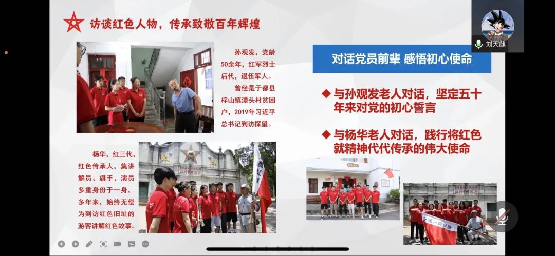 刘天麒同学参与组织“回顾党史情、重走长征路”暑期社会实践服务团,该实践团曾于2021年获得全国优秀团队。他从活动设计、最终呈现、收获总结三个方面开展经验分享,并就实践团队活动安排和人员分工等具体情况对同学们进行指导。刘天麒同学鼓励同学们积极参与社会实践,去经历、去成长、去游历自然美景、去领略风土人情、去发现个人价值,在实践中受教育、长才干、做贡献。