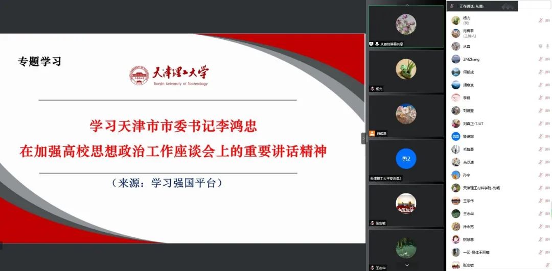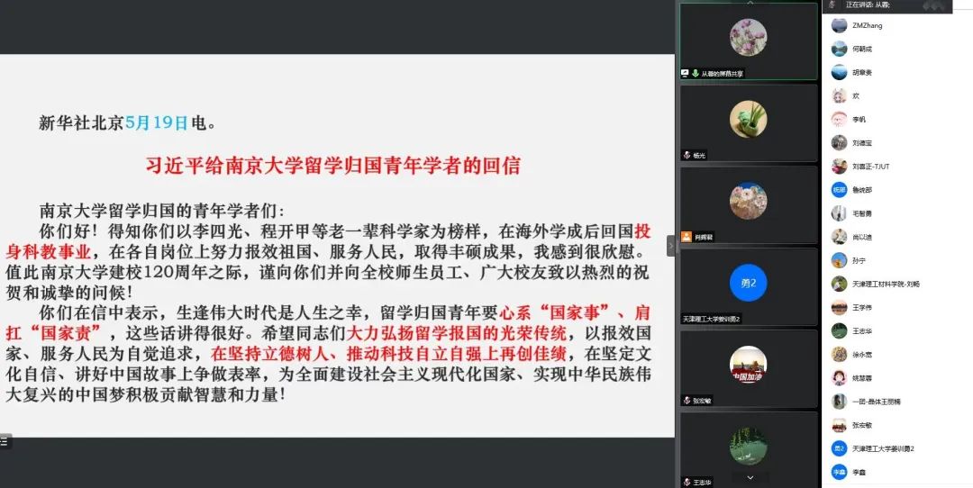 与会同志集体学习习近平总书记给南京大学留学归国青年学者回信精神及全市加强高校思想政治工作座谈会会议精神,一致表示,习近平总书记的重要回信饱含着对留学归国青年学者的殷切期望,为高校归国留学教师在教学与科研的新的征程上奋勇前行注入了强大精神力量;习近平总书记的重要回信内涵丰富、高瞻远瞩、情真意切、催人奋进,是习近平总书记关于教育的重要论述的最新内容,具有极强的政治性、思想性、指导性、实践性,为高等教育改革发展指明了前进方向,提供了根本遵循。通过集体学习李鸿忠书记在全市加强高校思想政治工作座谈会上的讲话精神,与会同志一直表示,要坚持全员育人、全程育人、全方位育人,统筹做好校园疫情防控,加强风险预判,强化阵地管理,主动回应师生关切,把思想政治工作贯穿于教育教学全过程。