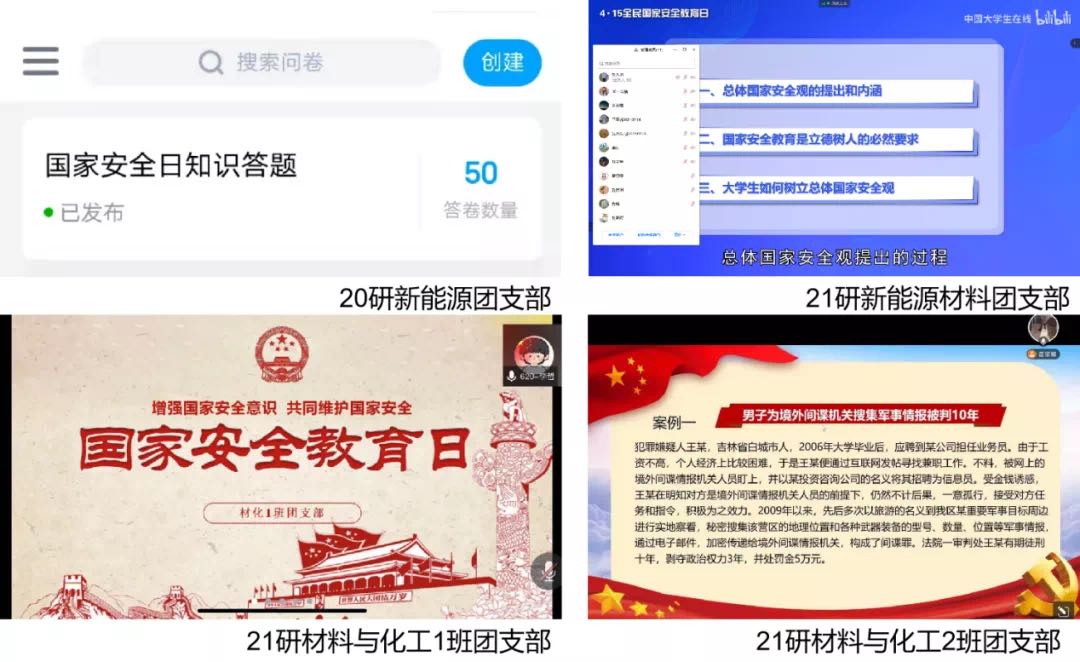 材料学院各基层团支部主动创新,采用主题宣讲、视频学习、案例分析、问卷答题等多种形式积极开展活动,营造了良好的学习宣传氛围。未来,学院党委还将通过多种形式开展线上线下国家安全教育活动,不断提高同学们的国家安全法律意识和防范安全风险警惕性,凝聚起维护国家安全的广大力量,将全民国家安全宣传教育落到实处。