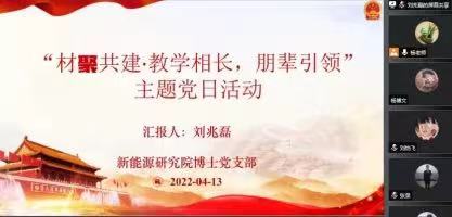 4月13日下午,新能源研究院党支部、新能源研究院博士党支部与硕士材料、硕士凝聚态、专硕第一、硕士工程、硕士新材料等五个硕士党支部联合开展“师生共建、教学相长、朋辈引领”线上主题党日活动,共有124名师生党员参加。陶柯颖、刘兆磊、张泉三位博士党员同志以“居家学习的科研进展、党的理论学习、多月来的抗疫志愿服务”为主题作了报告。