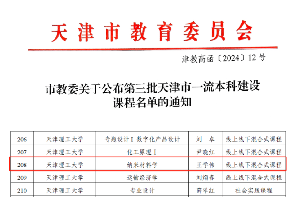 王学伟教授长期深耕于本科教学工作,不断凝练教学方法,总结教学经验,他所讲授的《纳米材料学》课程是我院新能源材料与器件本科专业的专业课程,受到师生一致好评。该课程此前已入选校级一流课程并获得学院教学成果培育项目资助,本次入选天津市一流建设课程名单是该课程获得的又一喜人成绩。