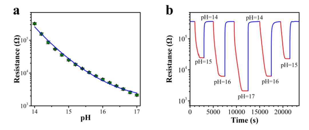图4. (a) SrCoOx基FET pH传感器对超强碱性NaOH溶液(pH>14)的电阻响应。(b) SrCoOx基FET pH传感器对超强碱性溶液的瞬态响应及可重复性测试。pH=14,15,16,17。