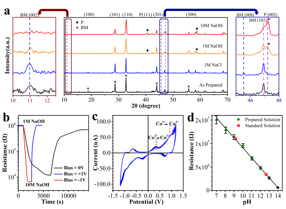 图2. (a) SrCoOx在不同处理条件下的XRD谱图。图中提供了SrCoO2.5和SrCoO3的“指纹”峰变化的详细信息,左右两个小图中展示了相关区域的详细数据。(b) 检测1M NaOH溶液时,FET器件上SrCoOx薄膜的实时电阻变化。(c)对称构建SrCoOx电解池的CV曲线,电解质为1 M NaOH。(d) FET传感器中SrCoOx通道材料对pH值 7-14范围溶液的电阻响应。