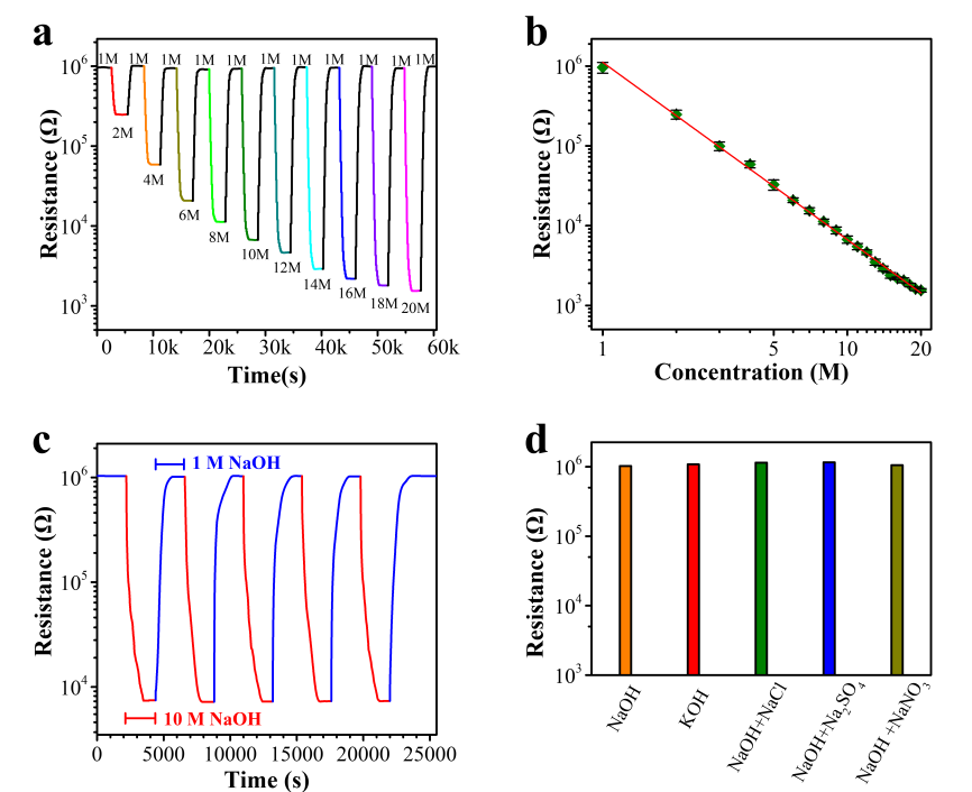 图3. (a) 基于SrCoOx材料的FET传感器对不同浓度NaOH溶液的瞬态响应行为。(b) SrCoOx基FET传感器的电阻随NaOH浓度的变化。(c)SrCoOx基FET传感器检测1 M和10 M浓度NaOH溶液的重复性测试。(d) SrCoOx基FET传感器对Na+、K+、Cl−、SO42−和NO3−离子的抗干扰能力;图中所有盐的浓度均为1 M。