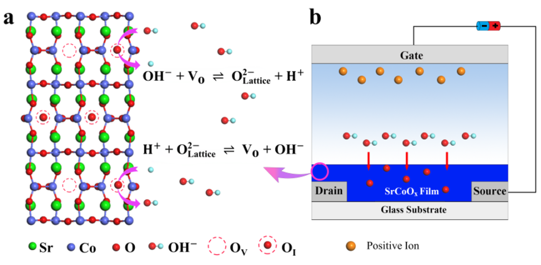 图1. (a) SrCoOx材料的晶体结构,以及通过O2-离子嵌入和脱出实现Vo缺陷变化的示意过程。(b) SrCoOx基FET pH传感器的示意图。SrCoOx晶体材料薄膜作为FET器件的通道材料,在电场作用下,可以实现强碱性溶液OH-中O2-离子的可逆地、快速地嵌入脱出。SrCoOx基FET器件的电阻响应与7-14范围的溶液pH值呈现良好的线性关系。