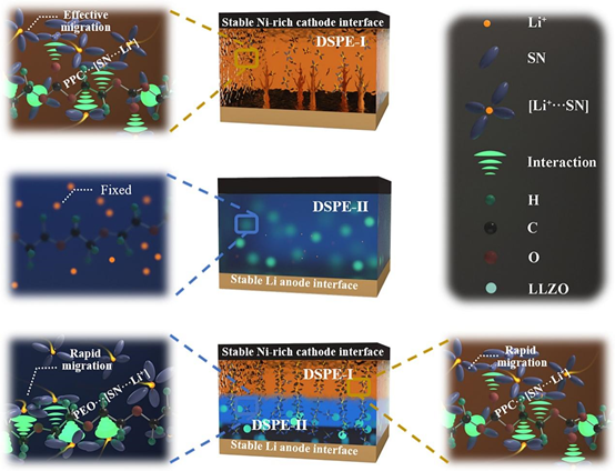 该文章开发了一种异质双层固态聚合物电解质(DSPE),并阐明其在室温下的工作机理。通过分子动力学模拟提出了丁二腈与锂盐之间的分子间相互作用形成溶剂化结构。密度泛函理论与系统的傅里叶变换红外光谱和核磁共振进一步证明丁二腈与聚合物之间的强相互作用,结合溶剂化鞘结构形成了快速的锂离子传输通道,为锂离子在室温下通过聚合物链段传输提供动力。此外,DSPE表现出前所未有的安全性能,这为开发高性能固态聚合物电解质提供了新思路。