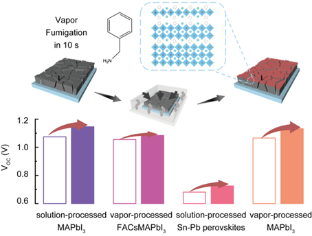图注:PMA熏蒸在3D钙钛矿薄膜上原位生成2D相钙钛矿示意图及其熏蒸处理对不同组分钙钛矿器件VOC提升性能图