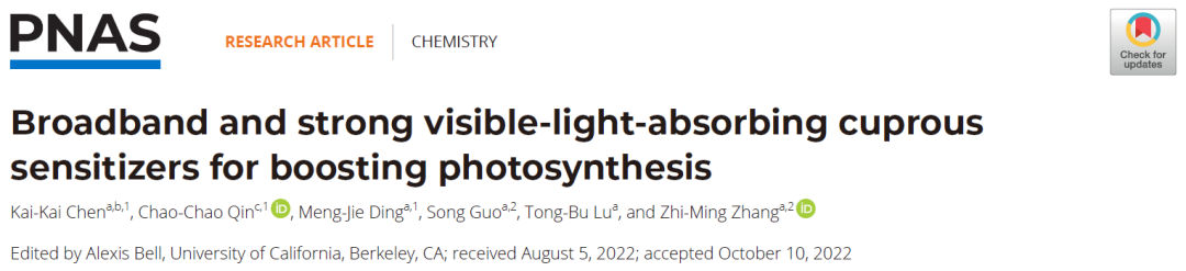 Chen, K. K.; Qin, C. C.; Ding, M. J.; Guo, S.; Lu, T. B.; Zhang, Z. M. Broadband and strong visible-light-absorbing cuprous sensitizers for boosting photosynthesis. Proc. Natl. Acad. Sci. U. S. A. 2022, 119, e2213479119. 论文第一作者:陈凯凯博士,秦朝朝博士,丁梦洁;通讯作者:郭颂副研究员,张志明教授