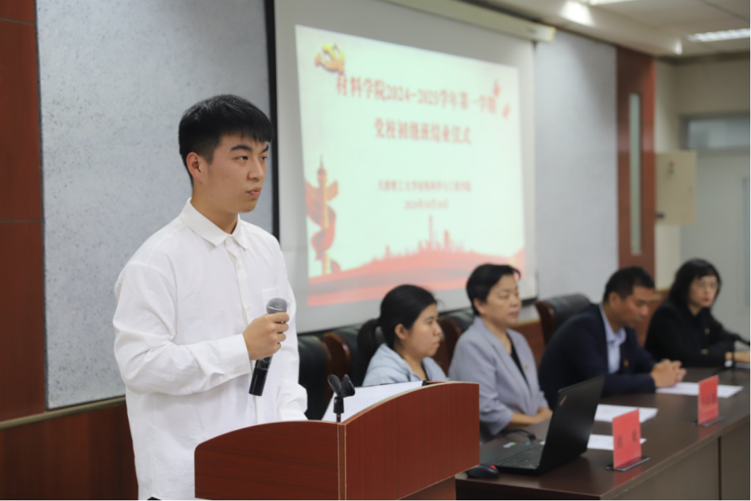 2023级功能材料专业张振煦同学代表全体初级班学员发言,他表示本次党课学习不仅提升了自身的政治素养和理论水平,也增强了服务人民、服务社会的责任感和使命感,今后将时刻牢记党的宗旨,全心全意为人民服务,为实现中华民族伟大复兴的中国梦而努力奋斗。