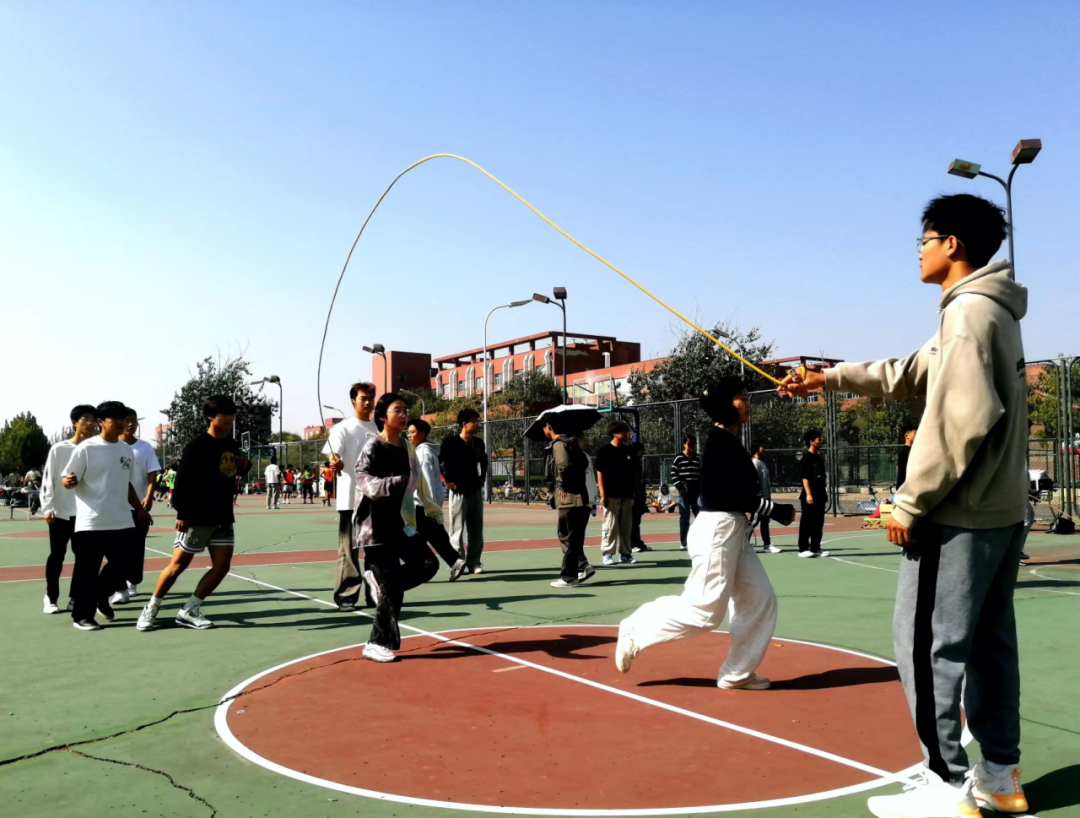 在“‘8’字跳长绳”项目中,同学们随着长绳的节奏奔跑、跳跃。此项目考验了同学们的团队协作和反应力。