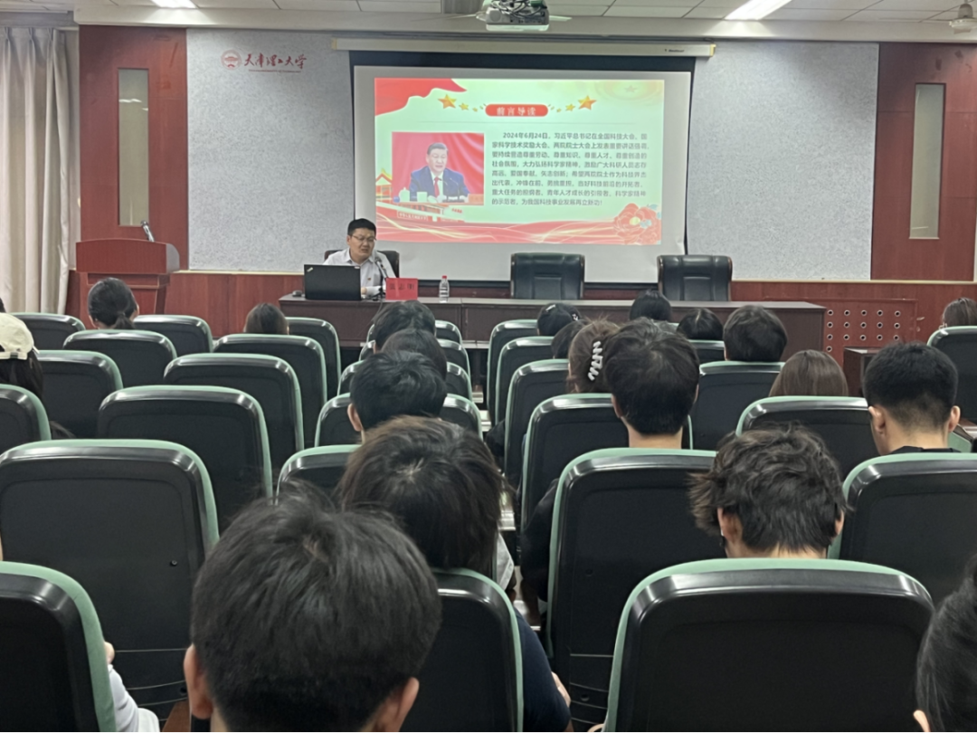张志明院长从自身科研经历出发,结合习近平总书记关于科技创新的重要论述,详细阐述了高水平科技自立自强对于国家发展的关键意义。他指出,在全球科技竞争日益激烈的当下,掌握核心技术、实现科技自立自强,是保障国家经济安全、推动高质量发展的重要支撑。从“嫦娥”奔月到“天问”一号火星探测,从5G技术引领到量子计算取得突破,中国近年来的科技成就背后,正是科学家们胸怀祖国、勇攀高峰的精神在支撑。院长结合我国科技发展"卡脖子"技术清单,列举了袁隆平、钱学森、南仁东等科学家的典型事迹,深刻阐释了青年科技人才的历史使命,点燃了学子们的报国热情。