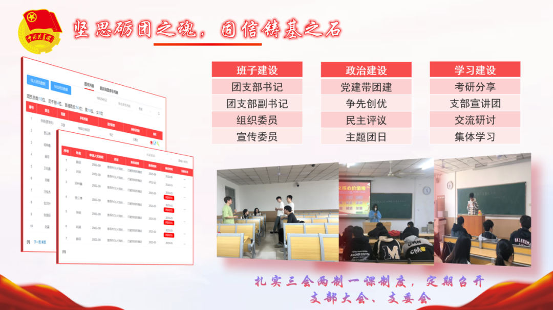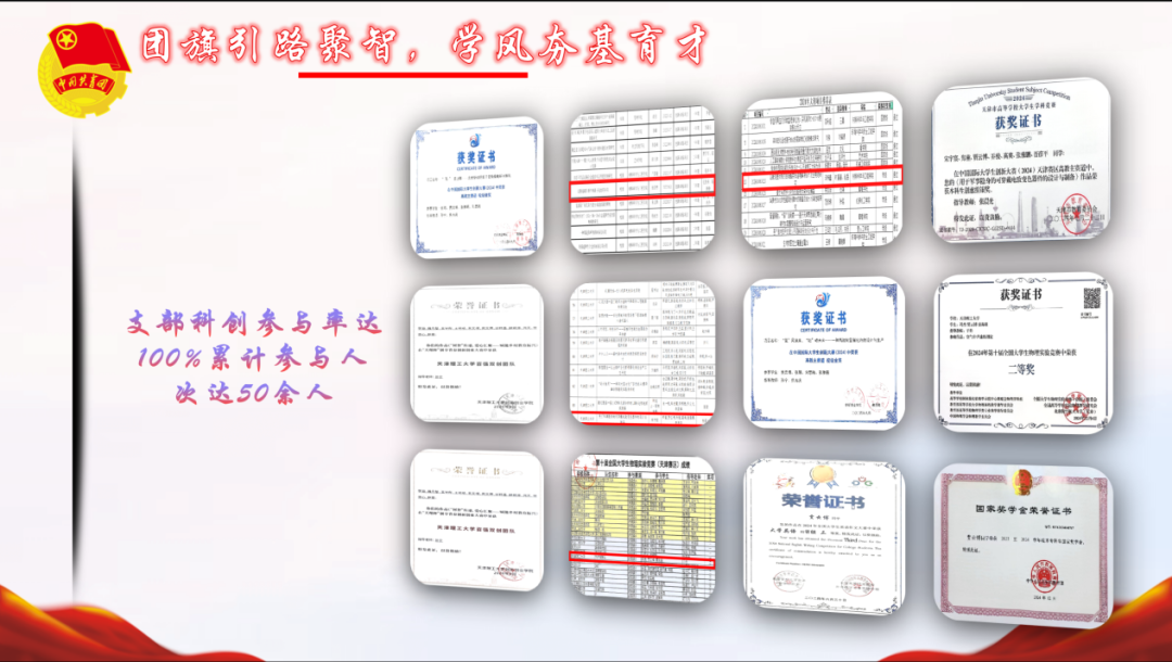 打造学习型支部,构建“支部笃实课堂”,开展了一系列学风建设活动,支部英语4级通过率达60%,支部团员获得国家奖学金、国家励志奖学金,校级人民奖学金。支部科创参与率100%,累计参与人次达50余人,拥有两项市级、校级大创项目,累计获得四项国家级奖项、三项市级奖项、四项校级奖项。