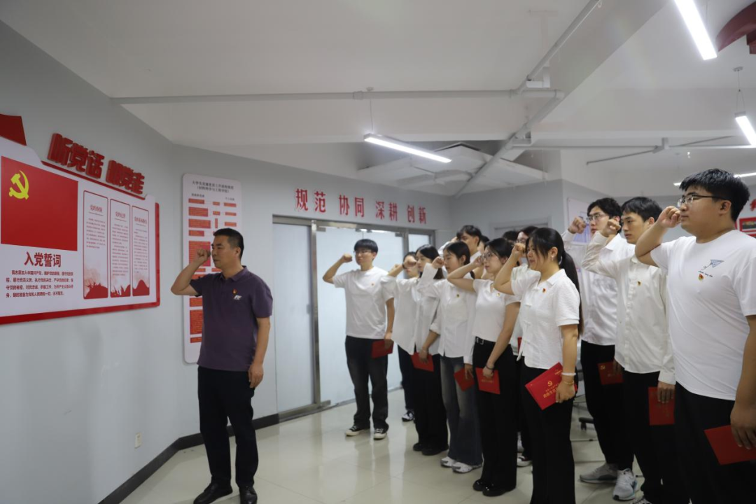 活动伊始,与会领导老师为毕业生党员送上“政治生日贺卡”。贺卡内页印刻着入党誓词与学院党委对毕业生党员的寄语。随后,全体毕业生党员面向党旗庄严宣誓,在掷地有声的誓言中重温入党时的赤诚与担当。
